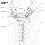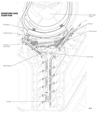 The Washington, D.C., and New York offices of Gensler, the design architect of record, responded with a crescent-shaped structure that slips quietly behind the landmark, separated from it by arrival and departure roadways. Though the TWA terminal will never be an operational component of JetBlue, it will house, when renovations are complete, an e-ticket kiosk for passengers who choose to enter there. Passage to T5 will be provided through Saarinen’s original tubular corridors, which have been restored and joined to the new terminal.