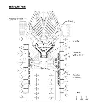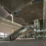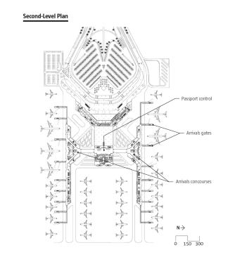 The 100,000-square-meter (1.08 million-square-foot) facility makes room for as many as 15 additional at new departure gates and remote stands, meaning weary flyers now spend less time taxiing to the gate. Once inside, passengers find themselves in an airy, light-filled environment, sheltered beneath a roof system of precast and poured concrete, shaped into a sequence of billowing baldachins. The effect of the more than 80 conjoined domes seems a gesture to the desert tents of the region’s past, and a light, decorative pattern traced on portions of the ceiling surface evokes the complex geometries of historical Islamic art. Yet the Foster team designed the roof with the future in mind—the insulating quality of the concrete helps to keep the building cool in the day and warm in the evening, reducing energy consumption while keeping Amman’s extreme climate in check.