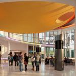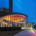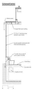 “The challenge was to create the impression of round spiraling forms with large, flat, structurally glazed units,” explains principal Sara Caples, AIA. The architects designed a unitized curtainwall made of 5,000 unique glass panels to suggest a perfectly round cylinder. Aluminum fins at the vertical joints in the system intensify the perception of a vanishing perspective as the fins move (and disappear from view) around the curving wall, and 2-inch-deep aluminum tubes on the interior surface of the glass breaks trace horizontally around the curving form. The project did not pursue LEED certification, but the architects diligently sought to make the building energy-efficient. They accomplished this by installing gas-filled insulated glazing units with low-E coatings to reduce solar heat gain, and by using silicone sealant joints rather than metal mullion caps. Laminated outer glass lites allowed for a larger unit size and help protect against vandalism.
