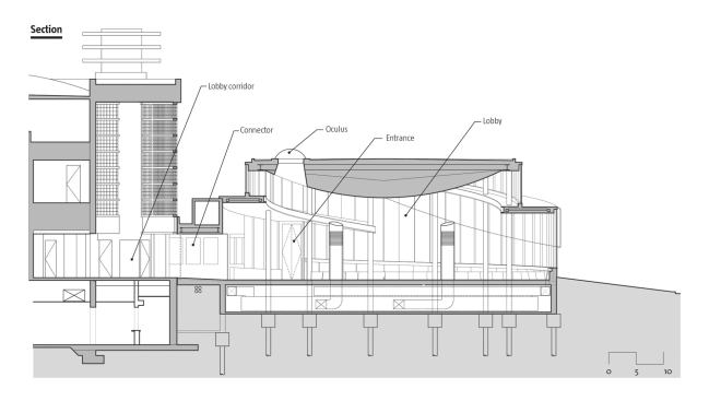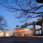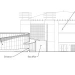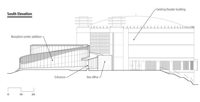 In the early 2000s, the theater’s growing success and popularity created a critical need for more space and accessibility. The city commissioned Long Island City, Queens–based Caples Jefferson Architects to undertake modernization and expansion of the theater for the limited price tag of $20 million. The program called for a renovation of some existing spaces, new offices and a 75-person cabaret in an addition that wraps around the existing theater building, and a mechanical system overhaul. The most noticeable new space, however, is a reception center, which provides a 600-person preperformance gathering area and leasable venue for non-theater-related events.