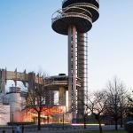 The contrasts are stunning, and one wonders why the remains of the World’s Fair haven’t either been repurposed or removed. Economics and bureaucratic inaction notwithstanding, the relevant answer is that there’s still life there. Theaterama, which Johnson envisioned as a venue for avant-garde art at the fair, was a technological marvel when it opened because of its use of slip-form concrete construction. Recognizing its commercial value, the city converted the cylinder, measuring 44 feet tall and 100 feet in diameter, into the Queens Theatre in the Park in the early 1980s, then commissioned a major renovation of the space in 1993.
