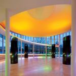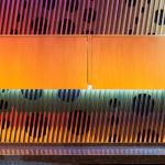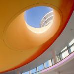 Inside, the ceiling plane is an inverted gypsum dome, clad in acoustic plaster over sound insulation, with three skylights rendered by deep round voids—a composition inspired by artist Barbara Hepworth’s sensuously carved marble sculptures. The ceiling and oculus walls are tinted orange and set the space ablaze when the sun passes over. At night, colored, cold-cathode lighting fixtures, muted behind a translucent acrylic fascia, spiral upwards around the perimeter.