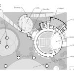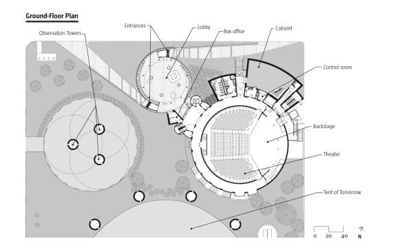 Caples Jefferson designed a glass cylindrical structure to complement the circular geometry of the existing theater. It’s a translucent form that subtly juxtaposes Johnson’s opaque one. The two volumes are conjoined at the 1993 theater entrance, but the reception hall is sited on axis with the skeletal remains of the gargantuan Tent of Tomorrow, with a view of the rusted observation towers—a move that cleverly concedes the visual clutter of the site, and frames it as strange beauty from another era.