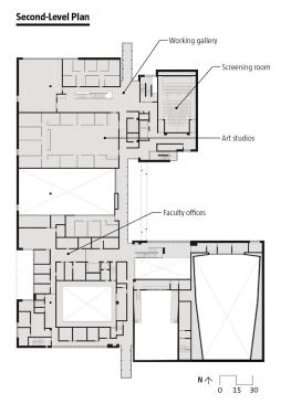 Williams: The number of arts elements that are packed together in this tight base and tower are amazing. If you were to really belt out music … [in a music ensemble room], the spaces adjacent would not hear it. You could have, next door, a dance performance going on, and you wouldn’t feel it. But you could go out into the hallway and have these two groups come together. So it was a struggle to put all these things together and have it be as technically advanced as it is.