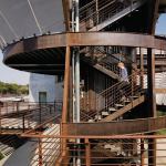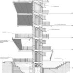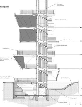 Imposing from the front, the Samitaur Tower actually has a relatively minimal structure. The core columns, which surround the stairwell and the elevator shaft at the rear, are constructed from 1/2-inch-thick steel plates welded to channel steel sections, a technique used in shipbuilding. The hot-rolled steel has a natural mill scale finish, and is treated with a clear protective coat. Each level is primarily supported by two wide-flange steel beams, which cantilever out—as far as 20 feet—from the column assemblies. The beams support galvanized metal platforms, which form the floor plates. “It’s a very aggressive structural system in terms of keeping that force in check,” says project architect Dolan Daggett. “It allowed us to do an uninterrupted structural skin on the perimeter, and create one giant image” on each screen. To deal with the concentrated point load, eight cast-in-place drilled piers, at depths of up to 65 feet, form the foundation.