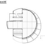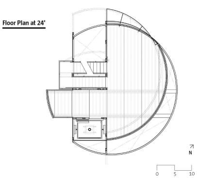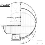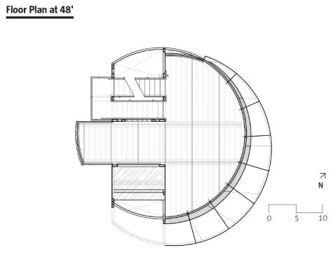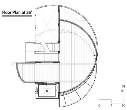 The screens were another technical challenge for the team. It’s one thing to create an electronic billboard, another thing entirely to create a giant movie screen capable of showing Stanley Kubrick’s 2001: A Space Odyssey. Because the tower was specifically designed for art, not commerce, a screen composed of bright LEDs was out of the question. The office worked with French company Arkema to custom-design the curved rear-projection screens. They are composed of a 1/2-inch-thick system of optical film sandwiched between two layers of coextruded acrylic. (The thickness allows them to double as guardrails.) Vertical acrylic fins from Reynolds Polymer allow for an uninterrupted image to be shown from ceiling-mounted projectors.