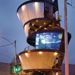 The tower’s form is defined by five offset steel rings, which are cantilevered off of steel beams at the rear. The rings are partially filled in with steel floor plates, creating different levels that can be occupied by tower visitors. The gap between each ring level is bridged by differently shaped panes of an acrylic and optical-film assembly, which, when viewed together, form an irregularly shaped rear-projection screen. Each screen is angled toward a different form of transportation: The first level is intended for street traffic, while other screens point toward the entrance to the tower, the future light-rail station, and the notoriously congested Santa Monica Freeway. “You could make the argument that we’re solving the problem of different vantage points,” Moss says. In situations where the geometry of the rings would dictate that the screen tilt up instead of down (reducing visibility) the architect omitted them, leaving apertures for taking in the view. The Samitaur Smiths are still mulling over what to show in their new drive-by theater.