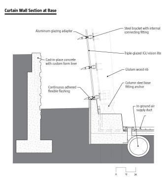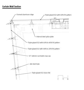 The curtain wallâs thermal performance eliminates the need for perimeter heating that wouldnât be supported by the buildingâs underfloor air distribution and radiant heating systems. The cost savings of eliminating the perimeter HVAC helped cover the more expensive glazing system. In addition to the cost savings of avoiding a fully customized system, âthere wasnât a lot of time to develop custom dies,â says project director John Schuyler, âso we challenged ourselves by using off-the-shelf systems.â Still, some things had to be specially designed, including customized connectors to attach the snap-on 12-inch-deep horizontal sunshades. One downside to a triple-glazed system, the extra weight, wasnât an issue here because of low overall height.