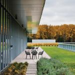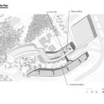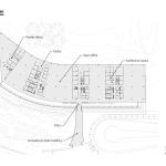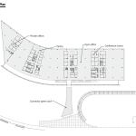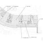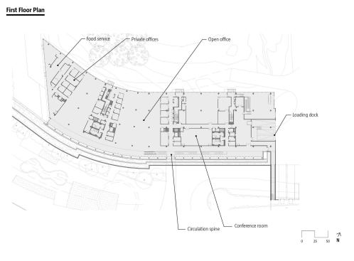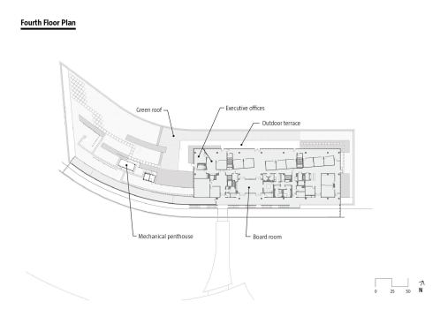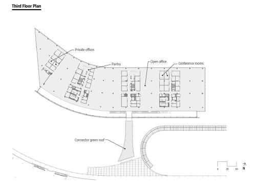The serpentine curve of the new building was designed and sited to create a Wi-Fiâenabled courtyard, a work and break-out space for employees, while maximizing views from the open office floors. To maintain the scale of the existing building, the site was excavated and the first floor of the new headquarters building sunk down into the ground, with a substantial light trough to ensure daylight still reaches the interior. Separated into four floors, the bulk of the new building is open-plan office space. Conference rooms and private offices are organized into corridors across the width of the floor plates, to keep views unobstructed.