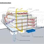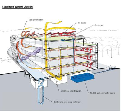 But getting to LEED Platinum takes more than just careful siting. The building doesnât employ any systems that are new to FXFowle, but âit does combine them in ways we have not before,â says Guy Geier, partner-in-charge of the project. To minimize heat gain and control heat loss during the winter, the team wrapped the structure in a triple-glazed curtain-wall system (see below). This intense insulation is paired with an HVAC system that includes underfloor air distribution, geothermal wells for heating, and ice chillers and evaporative cooling towers. There are electric HVAC diffusers embedded in the ceiling plane, but design partner Bruce Fowle describes them as backup. âThey are there in the event of an extreme condition, but would rarely be used,â he says. Site plantings manage stormwater runoff, while green roofs help to limit the heat island effect and provide an accessible outdoor space. Sharing the roof plane is an array of solar panels.