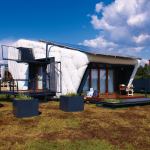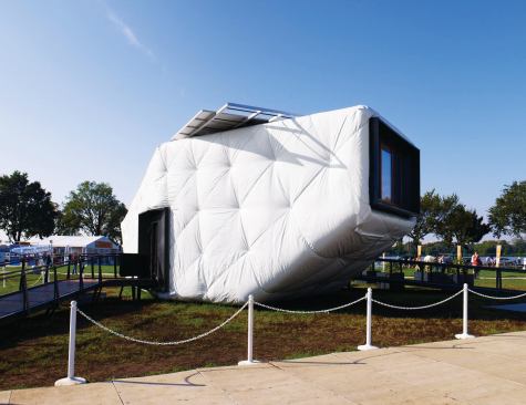 It’s part astronaut suit, part thermos. CHIP—as the California team called its entry—has an otherworldly appearance that belies its grounding in mainstream technologies. The house (whose acronym stands for Compact Hyper-Insulated Prototype) features an exterior skin made of 14 to 16 inches of denim batt insulation wrapped with a low-cost, engineered, vinyl-coated polyester fastened with zip ties, dowel rods, and lag screws. “Aesthetically, we are trying to convey the idea that solar housing isn’t just about putting solar panels on your roof. It’s also about how you conserve the energy once you harvest it,” say Robert Gilson, a student at SCI-Arc. CHIP unabashedly shows off “the thick insulation that it takes to conserve your energy and use it responsibly.” A key aspect of the energy conservation plan was to separate inside and outside air. The dwelling incorporates a whole-house fan that performs a complete air change in less than 20 minutes, with fresh air intake above the west entrance and exhausts in the collars surrounding the large openings. California’s spiraling land costs and urban sprawl helped influence CHIP’s compact design, which at less than 800 square feet is suited to infill development or neighborhoods zoned for shared lots. “What helped us with affordability is the assembly removes a roofing contractor from the picture, and it removes a siding and finishing contractor,” Gilson says. “One single membrane takes care of all the waterproofing.”