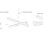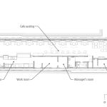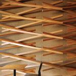 The principle, Kuma says, is to “start from a small, human-scale unit … [and carry it through] to the whole. It is one of these ideas of ours that a structure should be built up that way; everything is, in fact, made of tiny particles.” Each stick is 6 centimeters (2.3 inches) square in section, and ranges in length from 1.3 to 4 meters (4.3 to 13 feet). The pieces are woven together on the diagonal; notches carved into the sides of the sticks allow them to fit snugly together, and they are held in place with thin stainless steel pipes. The units build upon each other to form a latticework that covers the length of one wall and stretches across the ceiling plane. “The wooden weaving expresses a sense of depth,” Kuma says, “and customers of the café might feel [that] they drink coffee in a forest.”