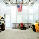 The horizontal bi-fold garage door by Wilson Doors eliminates the interference of interior overhead support structure and the operating mechanisms of more conventional garage door systems. By lifting outside the building, the door also does not block the skylights inside. A winch mounted at the top of the door assembly lifts the bottom edge of the lower door panel, which rides against a steel track that frames the door opening.