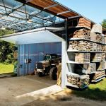 Essentially, the building is a utilitarian storage rack wrapped around an 800-square-foot workshop and storage barn for riding mowers, power washers, compressors, and the like. Tightly packed and palletized stone and wood are stored on flexible external shelves that allow easy access to each pallet without having to disturb the others around it. Sheltering the entire structure is a lightweight, translucent, 72-by-28-foot roof canopy that provides an evenly daylit interior workspace and weather-protected storage for stockpiles of loose sand and loam.