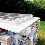 The solar panels are translucent and integrated into skylights in the roof—admitting daylight into the workspace below. The building produces more electrical energy than it consumes, allowing the owner to sell surplus electricity back to the regional utility company. It is a progressive system for such an unassuming building, says Organschi, who notes that “everything else about this building is very basic.”