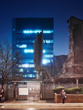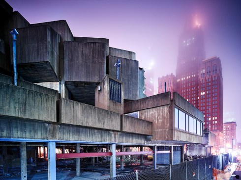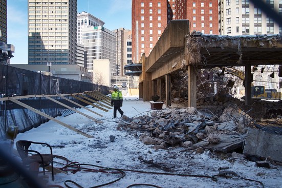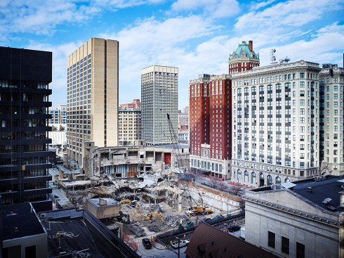 Photographing Mechanic’s demise is the latest project to stem from Carbone’s interest, as he puts it, in “buildings with complicated relationships.” He has also photographed Bertrand Goldberg’s Prentice Women’s Hospital (demolished), Kallmann McKinnell’s (now Kallmann McKinnell & Wood Architects) Boston City Hall, Paul Rudolph’s Orange County Government Center, and the Third Church of Christ, Scientist (demolished) designed by Araldo Cossutta, FAIA, when he worked under I.M. Pei. Carbone’s Mechanic photography series was the first time he had documented the demolition of one of these structures over time.