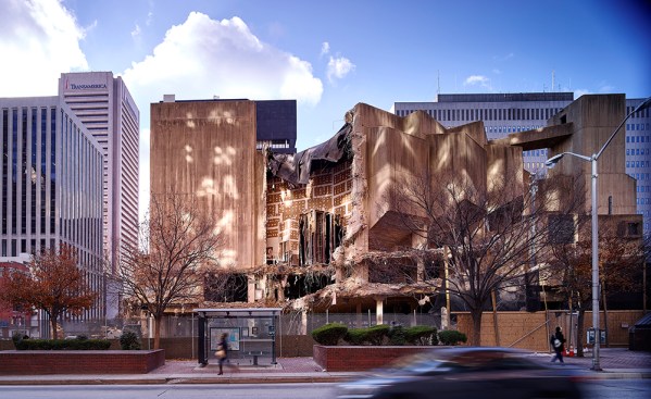 According to articles in The Baltimore Sun, the theater closed in 2004 after the operator—which was also involved with the city’s Hippodrome Theatre—did not renew its contract, and the theater was bought the following year. According to a 2008 article in the same paper, both Johansen and Shalom Baranes Associates (the Washington, D.C., architecture firm working with developer David S. Brown Enterprises on the new mixed-use project) floated proposals to preserve at least part of the structure. As Amanda Kolson Hurley reported in ARCHITECT, the Baltimore Planning Commission voted against a recommendation to landmark the building. At that time, Johansen (then 95 years old) said to Hurley: “It’s one of my best buildings, and to see it torn down—it’s very hard to take.” When Johansen died in 2012, his Baltimore theater was still standing, but proposals for the site included demolishing the structure. Demolition kicked off last fall to make way for the One West Baltimore project: four floors of retail topped by two residential towers.