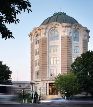Fortunately, the elaborate public spaces inside the tower were relatively intact. Trivers Associates’ job was to retain that integrity while modernizing the building. The centerpiece of the two-story rotunda—the sinuous marble stair, a popular setting for photography of local brides—simply required a good cleaning. And a few sins from the past needed to be reversed: One of the arches circumscribing the room had been filled in with a solid wall. That was torn out and rebuilt in keeping with the original oak partitions, then topped with frameless clear glass. The rotunda’s original pendant light was restored, and new linear pendant lights were installed in the surrounding offices on the first and second floors. New sprinkler piping was concealed in the walls and soffits, with exposed heads placed strategically to be as unobtrusive as possible.