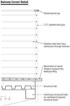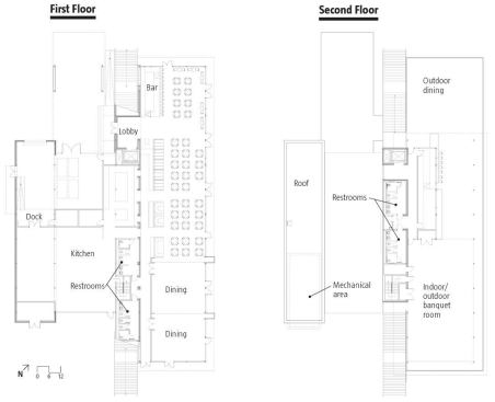 The exposed steel frame conveys the building’s structural rationale and gives a background syncopation to the spaces. Detailing is crisp and precise. Wood ceilings formed by installing cedar planks in the bottom flanges of the spanning members bring warmth to the dining space. Wooden floors extend into surrounding outdoor decks, and beams terminate in supporting brackets for the roof overhang, drawing inside and outside into continuity. Low-level interior lighting allows for outside views to be prominent, day or night.