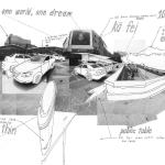 Today’s American coffeehouse chain finds itself stretched (see napkin timeline, above) as it tries to act as both counter and café. DesignLAB’s exploration seeks to exploit this distinction by creating complementary brands and associated store models offering two distinct kinds of urban space.