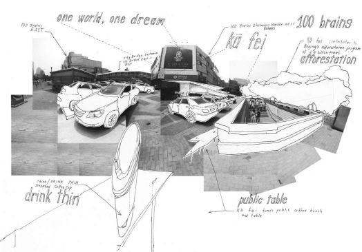 Statement: The space of the American café emerges from the horizonless recesses of the Woolworth lunch counter, where gallons of pale brown water were slung from bulbous Pyrex urns into the proverbial “bottomless cup o’ joe.” Not until the mid-1970s did the American notion of coffee begin to condense around the space of the European café—that place of communal politesse so far removed from the lunch counter. At the lunch counter, we face the wall in single file, removed from social discourse and absorbed in solitary self-reflection. In the café, we find ourselves at the table, in the round, immersed in the well-oiled social discourse that caffeine fosters.