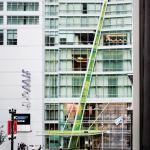 The small, 9,500-square-foot corner site is filled to its limits by the 250,000-square-foot building, which was developed as two discrete pieces. The north half exposes the structure’s concrete frame, while the south comprises the hotel’s signature folded glass façade and the dynamic canted roof that rises toward the intersection of State and Lake streets. Breaking the mass of the slender building gives it a smaller scale on the streetscape—in contrast to its generally larger neighbors. The chartreuse glass of the lightning bolt bends to fill the canopy protecting the entrance—and casts its wickedly hip color onto pedestrians unlucky enough not to stay at the hotel.