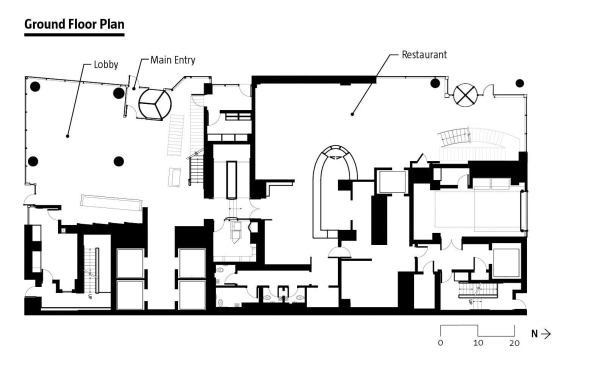 A double-height lobby puts the Wit’s comings and goings on display for riders on the adjacent elevated trains; the north end of the building sandwiches two of the hotel’s three eateries—the more casual on the first floor, the more formal on the second. A single separate entrance from the street allows public access to both.