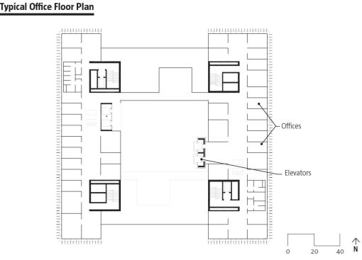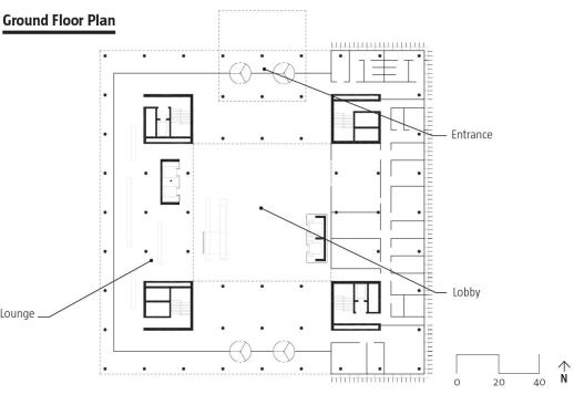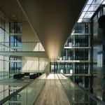 For the design, the team shied away from a traditional corporate tower. “We decided not to do a high-rise building like you would find in New York,” JSWD co-founder Jürgen Steffens says. “The gesture was too big for ThyssenKrupp, so we decided instead to make a small high-rise.” Rising 165 feet, and standing at the head of a long reflecting pool that leads some 980 feet to an access road, the headquarters building (otherwise known as Q1) is the clear center of operations on campus; the eight surrounding buildings have a maximum height of 82 feet to give the complex “a more human scale,” Steffens says. Every building is situated around an atrium or courtyard to “signal that the people work together and have a dialogue,” he adds. And the organization of the program also helps this cross-pollination. More than 500 people work in the headquarters building, and meeting rooms and the employee canteen are located in other buildings on site.