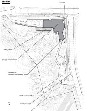 Those strategies start with an L-shaped footprint for the 16,776-square-foot building, pushed to the street edges of the four-acre site to avoid intruding on the surrounding woods. Parking beneath the building, plus the city’s permission to have 29 cars park on the street, reduced the city’s parking requirement to only 26 paved spots on the site. Cost-cutting sacrificed a green roof, but a rain garden, planted with sedges, slows down and helps filter stormwater runoff that percolates into a nearby retention pond.