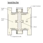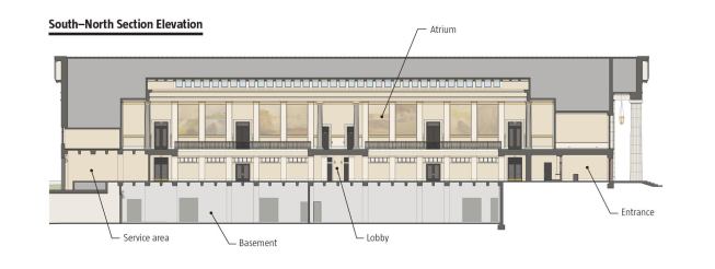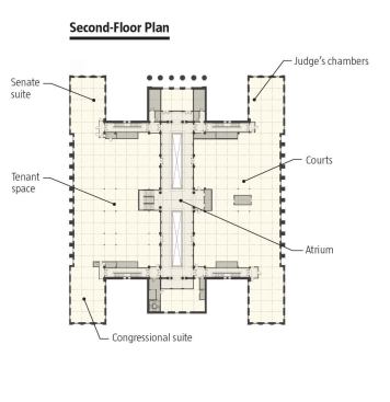 The building is organized around a central, two-and-a-half-story-tall atrium that bisects the building into east and west wings. The allocation of uses is clear: On the first floor, the Social Security Administration is on the right, jury assembly is on the left; upstairs, the FBI and Sen. Shelbyâs offices are on the right, and the courts and judgesâ chambers are on the left. Public stairs on either side of the entrance quickly access the chambers of the U.S. Judge and the senator, while centrally located elevators and a double-run stair lead to the second-floor courtrooms and other offices. The 165-foot-long atrium is relatively narrow on the first floorâonly about 11 feet in widthâbut expands to 33 feet on the piano nobile. Itâs the second floor where the buildingâs Classicism really singsâwith Ionic columns flanking spaces in each of the cardinal directions and 16 panels of public art that tell local history in an accessible, realistic style.