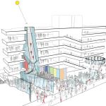 Conditions provided challenges, but also creative opportunities: The top of a ramp leading to below-grade parking projected into the ground-floor shopping area, so BCJ integrated it into a topographic stairway leading to the upper levels. And rather than disguise a subway entrance hidden at the rear of the building, the architects opened up the station corridor with a glass wall, allowing commuters to see into the dramatic Uniqlo atrium.