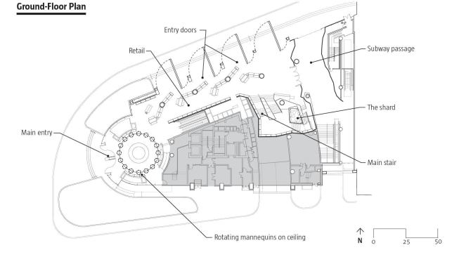 âWe asked ourselves, âHow do you get people to go upstairs?â â says Bohlin of the five-story store. âIn my early years I did a good deal of cave exploringâspelunkingâand for a young architect it was an object lesson: I learned about titillation and about how to draw people into a space.â Bohlinâs cave analogy is closer to the truth than you might expect: A 67-foot-tall atrium, called âthe shard,â sculpturally cuts through the floor plates of the existing structure, bringing in daylight and luring people upstairs. Its geometry is not unlike Bohlinâs cave, but made out of steel gravity tubes and glass panels.