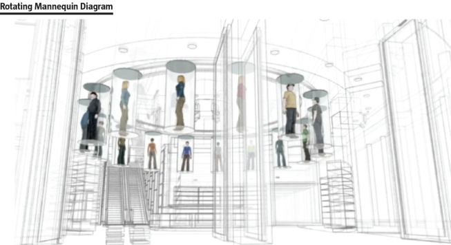 On the ground floor, mannequinsâin futuristic acrylic capsules that move along a circular trackâring the bull-nosed front of the store. Robotic lighting tracks both the mannequins and customers, putting everyone on display. Ultimately, in a space packed with as many challenges as the shelves are with colorful products, the architects orchestrated a playful experience.