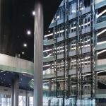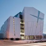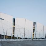 “The building is really inward-looking since there’s really no need to look out,” explains van Egeraat, citing the bleak urban fabric and lack of sunlight (in December, there can be as little as five and a half hours of sunlight per day). Openings in the envelope take the form not of ribbons of windows, but rather of sharp, glazed cuts through the building’s skin that provide occasional sight lines from inside the space. The façade is further crisscrossed by a series of coves with an integrated lighting system; at night, the fixtures create a network of lines of light on the surface.