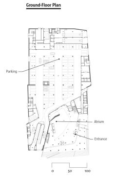 The client, a civil contractor, began construction on the project in 2004, but became dissatisfied with the design as it had been conceived by a local architect. They paid a visit to van Egeraat—who maintains an office in Moscow to oversee ongoing projects in Russia—to inquire about taking over the project, which he agreed to do. But because of this arrangement, the firm was handed a predetermined footprint that it could then author in section and elevation.