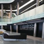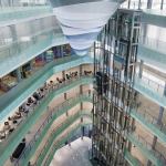 The white panels that form the skin can also be used to display custom advertisements that fit like puzzle pieces over the whole building’s façade, bringing some dynamism to Surgut’s relatively nonexistent skyline. “We wanted to create a building that was something entirely new for the community, and something that would be recognizable,” van Egeraat says. The playful geometries are carried through to the 37,050-square-meter (398,802-square-foot) interior, where many walls and columns are slanted in an effort to carve out unique spaces from the vast building volume.