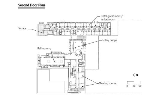 The layout of the hotel provides spaces for both public gawking and secluded dealmaking. Because the site sits atop a busy Metro Rail stop, riders can catch a glimpse of Hollywood bigwigs at work as they approach the escalators. On the second and third floors, rooms have been converted into special spaces for press-only junkets with celebrities. The lobby, with its dramatic circular staircase (very Fontainebleau, as some critics have pointed out) and a chandelier (by Portland, Ore.–based Designstudio Ltd.) with cascading Swarovski crystals, is pure Hollywood.