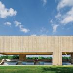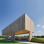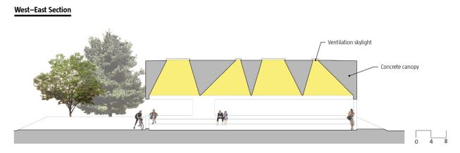 Thanks to the pavilion’s boxlike form, the architects were also able to minimize the visible supports and promote a visual seamlessness between the enclosure and its surroundings. A thin concrete canopy would demand a grove of columns, but the volumetric roof allowed the architects to embed bracing beams within, minimizing the structural demands underneath. “By going with this robust depth, we could achieve a cantilever,” Cooper says, which wouldn’t have been possible with a thin concrete profile.