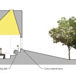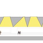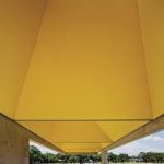 Rather than follow the precedents for a minimal profile, Cooper Joseph went maximal. “We didn’t want thin,” says partner Chris Cooper, AIA. “We went robust.” But the impressive volume of the pavilion’s crown is no mere flourish. Within the concrete roof, the architects embedded four hollowed-out voids, each culminating in a uniquely shaped vent. Together, these create an airflow through the pavilion, drawing hot air out from under the roof. Painted bright yellow, these cavities animate the pavilion space and cool it as well. A berm hugs the seating area on three sides and serves as a thermal mass that reinforces the cooling effect.
