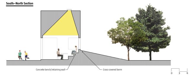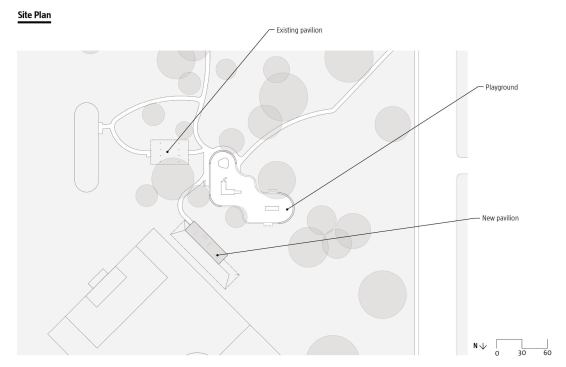 While the form allows for ventilation and a simple structural resolution, it also accomplishes one of the central objectives of the Park & Recreation design excellence program: It establishes a striking visual landmark. “We tried to make something of consequence,” Cooper says, but also “something that didn’t seem to just drop from the sky.” Nestled as it is into the landscape, the pavilion seems anything but.