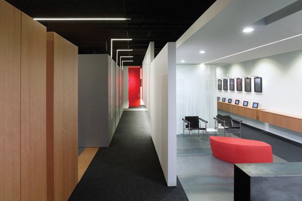 Located in a two-story brick commercial building, ASK’s headquarters are rich in such moments: partitions with enigmatic vertical gaps, an interior window set at shin height, glowing LED light strips that slice into walls and ceilings (shown above). “We tried for a bit of ‘wow’ factor,” Schipper admits, but the underlying purpose is “to show clients possibilities. A wall doesn’t have to be continuous; it can have a moment in it. Light fixtures don’t have to be picked out of a catalog.”