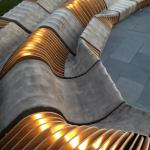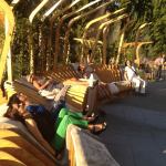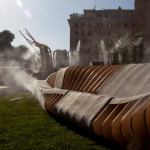 Unire/Unite is the winning installation in this year’s YAP_MAXXI Young Architects Program (YAP), and the painted title—which, in a whimsical twist, glows in the dark—is merely the beginning. In the adjacent park, a walkway made from ground, recycled rubber leads to the Infinity System, a 40-meter- (131-foot-) long ribbon of seating. Made from ribs of marine plywood, with sections cushioned by a concrete canvas material, the sinuous form of the bench allows visitors to sit and enjoy the Roman summer and supports a variety of body positions—even yoga poses. Some ribs extend first vertically to form a trellis for vines that provide shade, and then reach out horizontally over the benches below, forming a canopy. Like its American cousin Wendy, the YAP-winning installation designed by HWKN and installed at MoMA PS1 in Queens, N.Y., Unire/Unite is also outfitted with misters that spray water to help combat the summer heat.