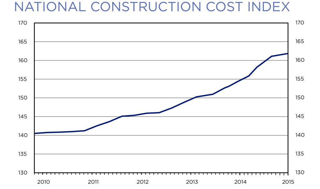 The chart above shows the national construction cost index increase from January 2010 to January 2015, from low 140’s to just under 163.