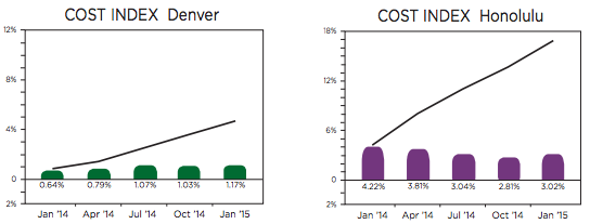 The report’s research shows a 5.5 percent increase in the national average in construction cost from that January 2014 and December 2014. The city with the highest annual increase is Honolulu, with 13 percent; meanwhile, cities such as Washington, D.C., New York, Denver, and San Francisco witnessed milder increases, ranging from 4 percent to 6 percent.