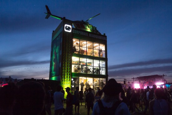 Paneled with clear glass windows, and topped with a fiberglass helicopter, the three-story building created by the Southern California couple specializing in visual arts and design sparked a buzz among the festival’s crowd. However, the vital organs—in this case, frantic hippo-headed humans in what seemed like a normal office environment—stole the show. With the ground floor mailroom, middle management above, and the executive suite on top, the installation was a well-executed parody of corporate America, complete with a billboard advertising “Pond Water: Fragrance for Hippos.”