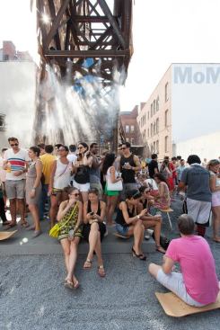 In 2000, the newly-merged Museum of Modern Art P.S.1 launched the Young Architects Program, an annual competition for young architects to design the backdrop for the party. This year, the winner is Caroline O’Donnell, a young architecture professor from Cornell University and the founder of the architecture and research firm, Coda. Her design, “Party Wall,” is a 40-foot high sculpture composed largely of scrap wood (from an eco-friendly skateboard company, more on that shortly), steel, and large bags of water that weigh the thing down. There’s a misting nozzle to keep the crowd cool, and a few jacuzzi-like pools of water where you can dip your feet. And when I arrived last Saturday, a few children were using the water as entertainment. Everyone else was wandering laconically around, scarcely glancing up at the architectural intervention. The beer and M. Wells corn-dog menu were subject to much more intensive scrutiny.