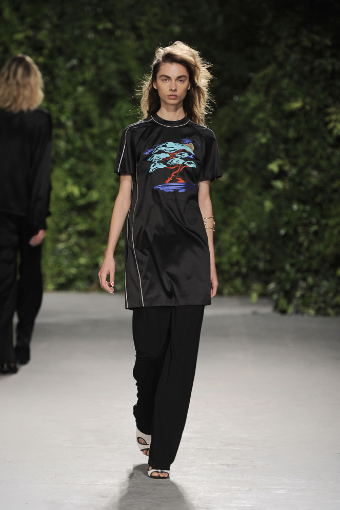 Taking care of that missing component is Opening Ceremony’s Spring/Summer collection, named “The Living City,” which debuted this past week at New York Fashion Week. The New York–based fashion house, founded by friends Carol Lim and Humberto Leon, created neutral-toned clothing that included tight, basket weave dresses, long lightweight coats, trouser pants, and silk tops with Bonsai trees, which refers to his avid Japanese art collection. Golden, orb-like pendants also showed up regularly, either near the collar or along a button-down shirt, perhaps alluding to the boleros and bow-ties Wright wore.
