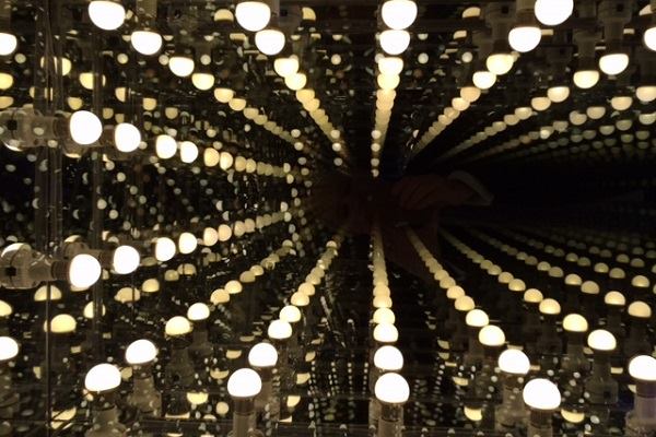 In Korean artist Lee Bul’s installation Via Negativa II, now on display at Lehmann Maupin in New York through June 21, the viewer becomes a ghost in the machine. Once you reach the center of the labyrinth she has constructed out of metal and glass, you find yourself reflected into infinity, but not clearly: You are obscured by the array of light bulbs running all around you, so that you seem to be only a memory of a human being.