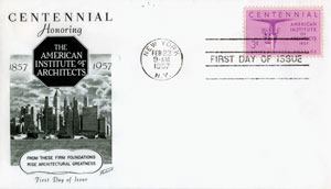 Collectors prize the stamp on envelopes bearing the first postmark of the first day of issue: 9 a.m. on Feb. 23, 1957. On that day 100 years earlier, 13 architects met in New York to create the organization that would distinguish the profession from the building trades. As the AIA gathers this month to celebrate another 50 years, the stamp serves as a worthy salute to the founders’ intentions.