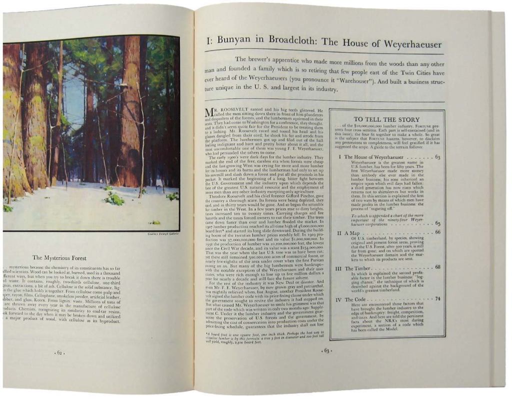 Skyscrapers, smokestacks, and machine-shop gears take on the elegant geometries and abstractions of art deco, the prevailing art movement of the time. Some artists, such as Antonio Petruccelli (1907–1994), were regulars. Petruccelli contributed 25 Fortune covers including the April 1934 issue, which shows a composition of sawmill blade and cut log that raises lumber to a new aesthetic. (The cover story, “Bunyan in Broadcloth,” focused on the Weyerhaeuser empire.) Fortune‘s December 1937 issue portrayed Manhattan’s high-rise temples of business as ornaments on a pyramidal Christmas tree.